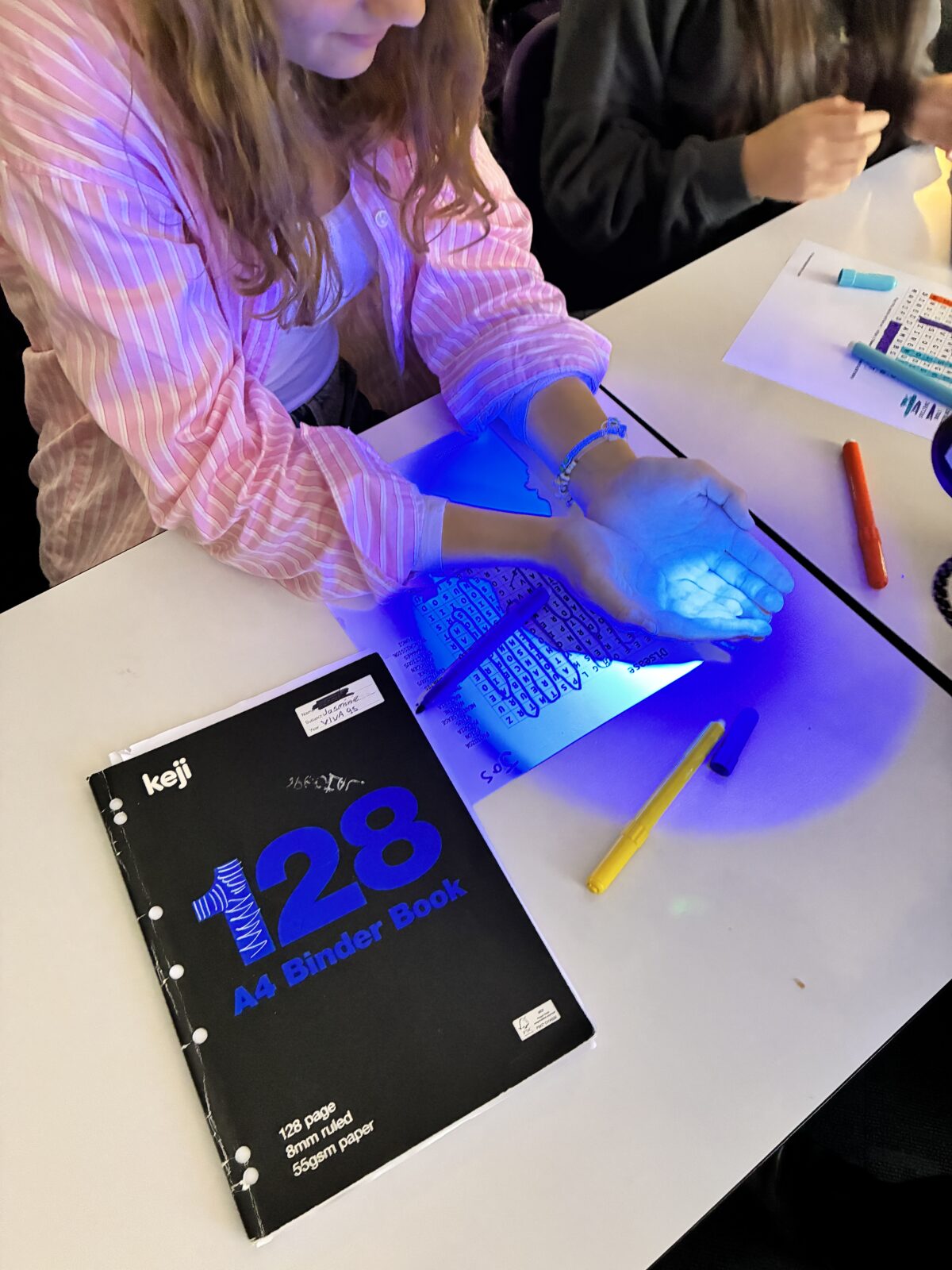 With the guidance and infectious enthusiasm of Dany Alarab, Benn Wolhuter, and Learning Support Officer Jo Conway, the lesson unfolded like a scene from a detective story. The classroom transformed into a high-stakes investigation when an ordinary object, secretly dusted with UV powder, became the “fomite” responsible for sparking an outbreak.